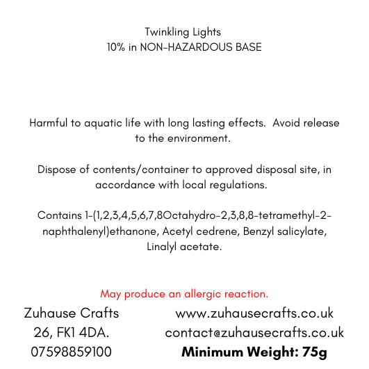 Our Twinkling Lights wax melt is a woody, floral, musk fragrance which opens with top notes of bergamot with peach leading to a heart of almond, heliotrope, orris, jasmine, gardenia, and a base of cedarwood, amber, musks, vanilla, and sandalwood.