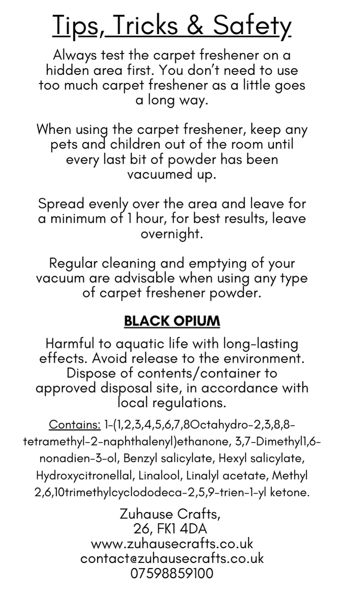 Revitalize carpets, upholstery, mattresses, and fabric car interiors with ease using our Black Opium Carpet Freshener. Simply sprinkle directly from the bag, use a sieve, or pour into an empty shaker bottle.