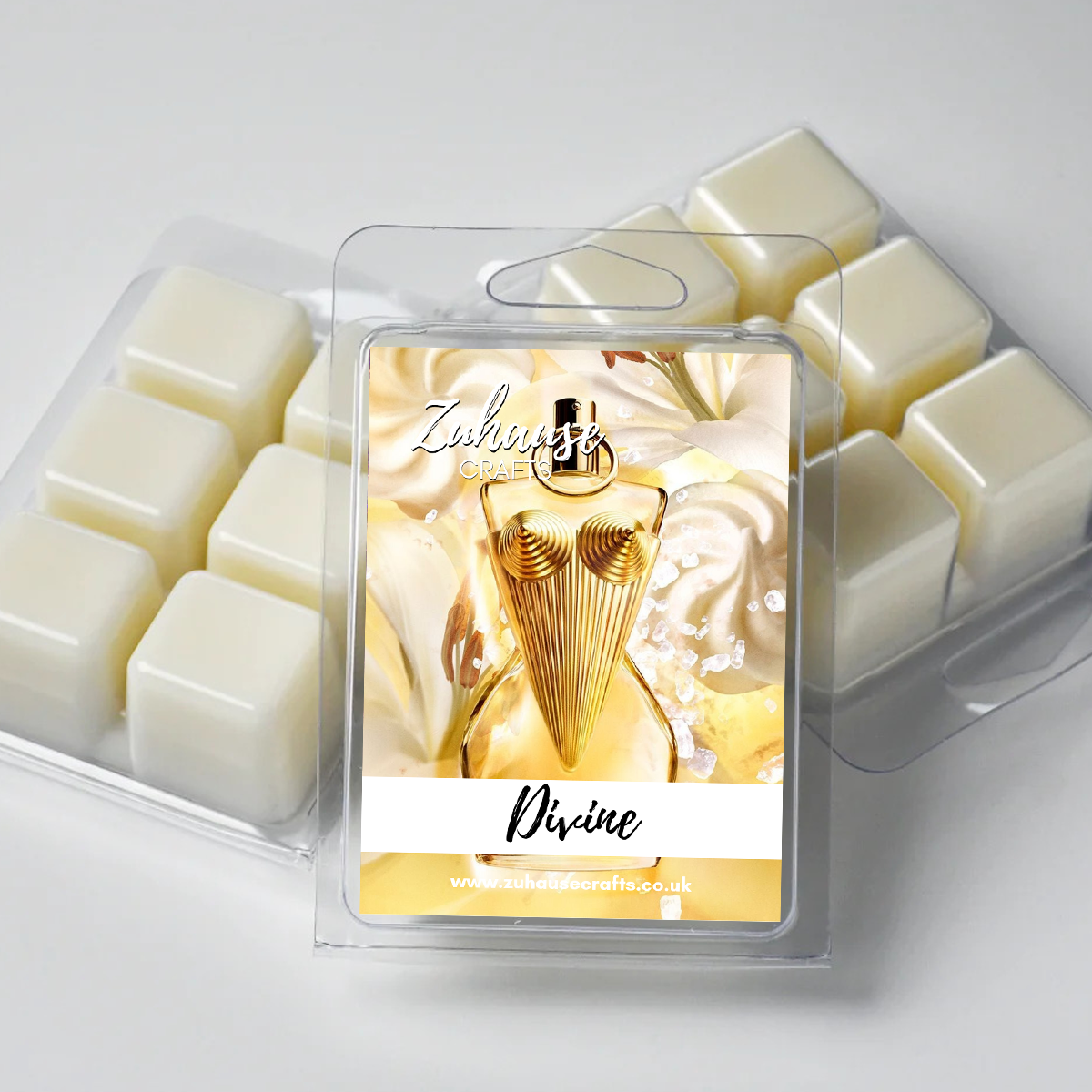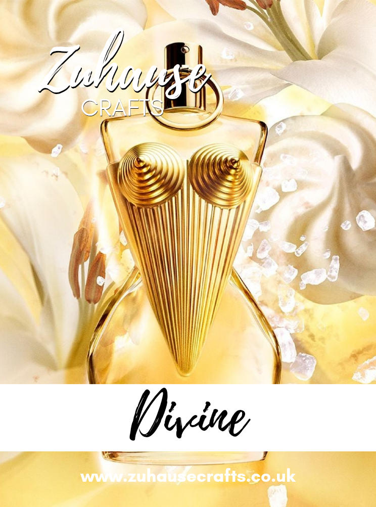 Our Divine wax melt is inspired by Divine by Jean Paul Gaultier. A floriental fragrance opening up with sea notes, bergamot and red berries, this leads onto a floral heart of ylang, jasmin and lily, all while resting on a base of meringue, musk and patchouli.