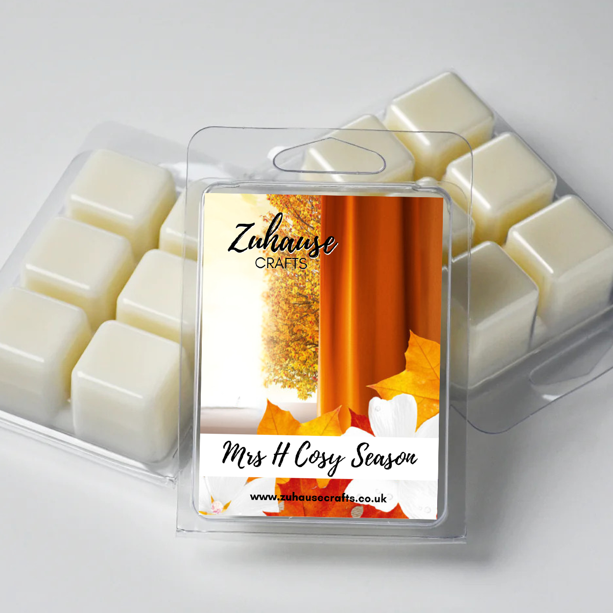 — A Mrs H Cosy Season Wax Melt, hand-poured from a premium blend of rapeseed and coconut wax for a long-lasting scent throw that fills the home with soothing fragrance.